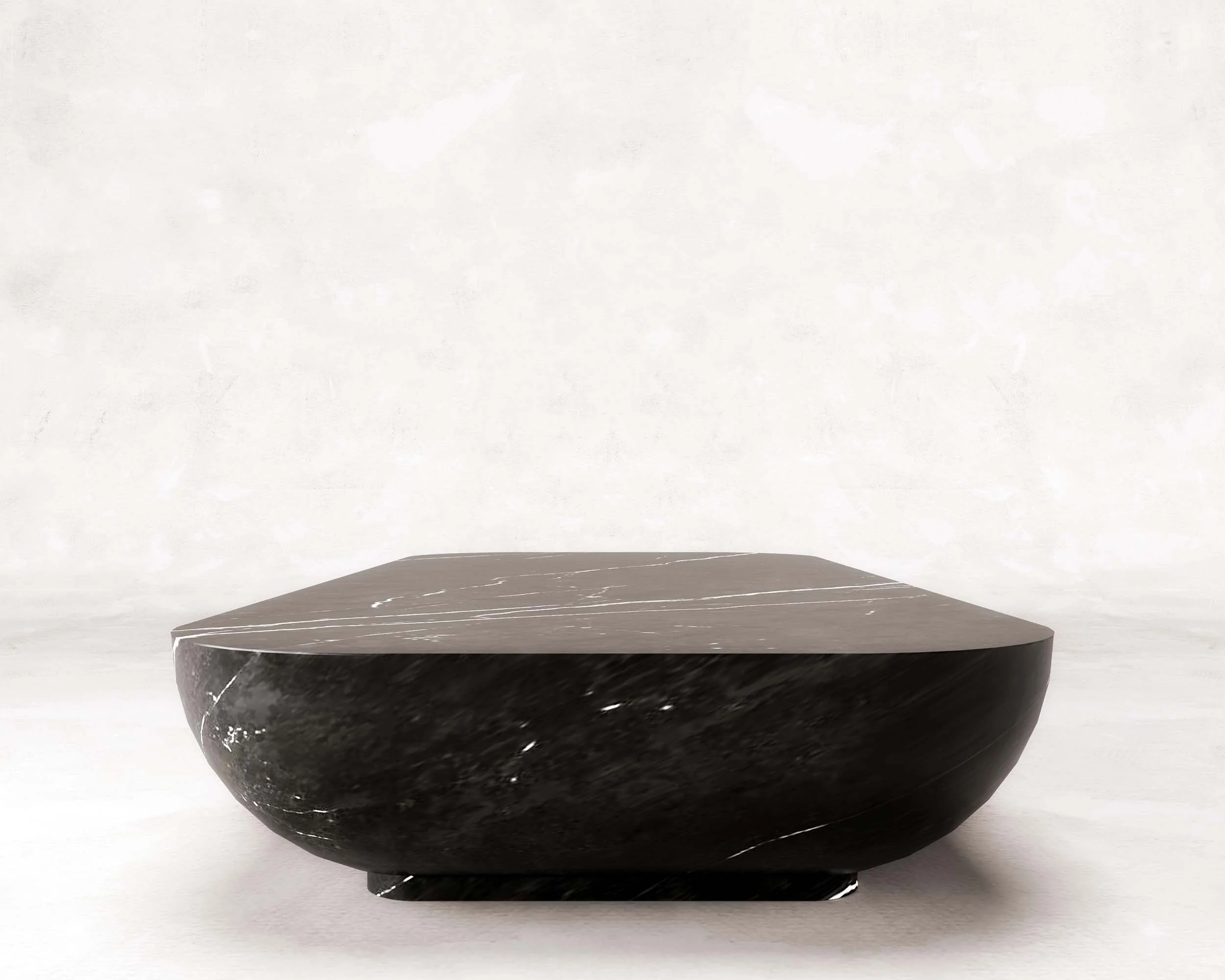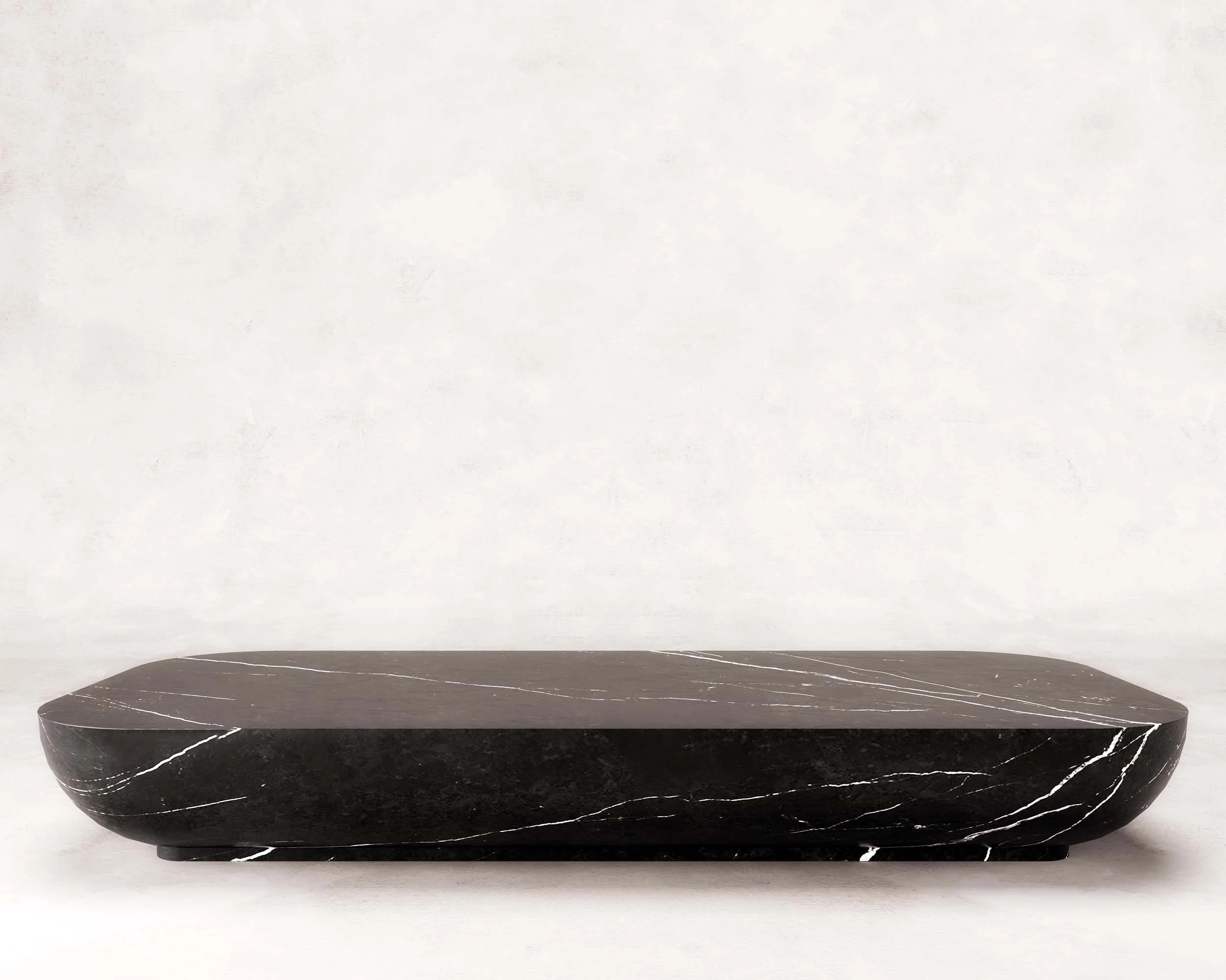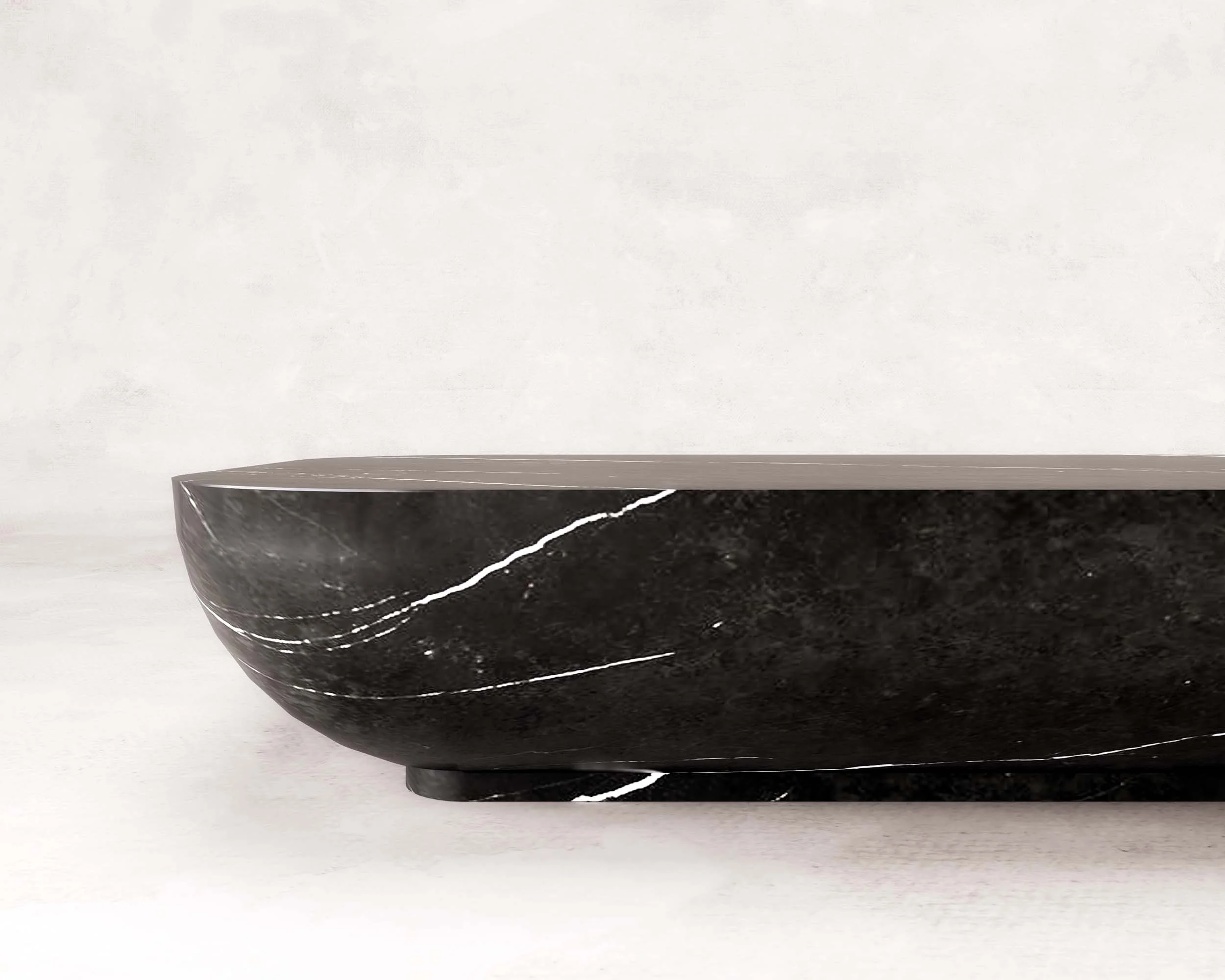 Low-lying continuous form with gentle curves, diffusing the light and drawing out the white calcite veining against the saturated dark marble