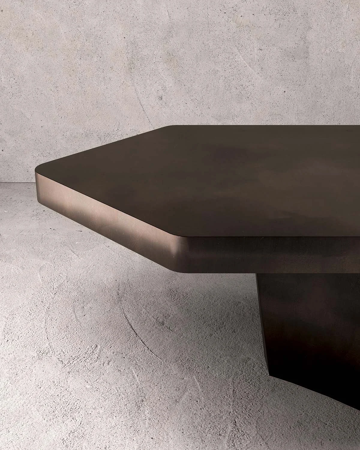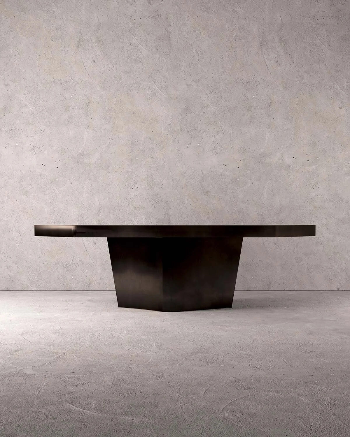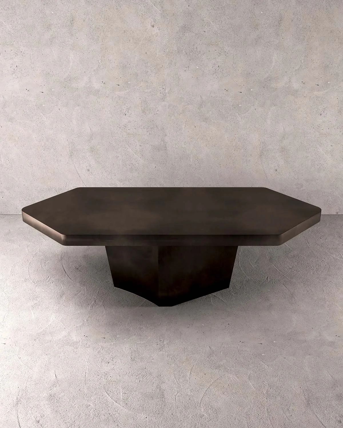 Sculpted with a hexagonal, diamond-ended horizontal plane, the formation asserts its presence with quiet singularity. The pedestal curves inward with subtle concavity, while light diffuses across its blackened bronze surfaces as a push–pull motion becomes visually conscious