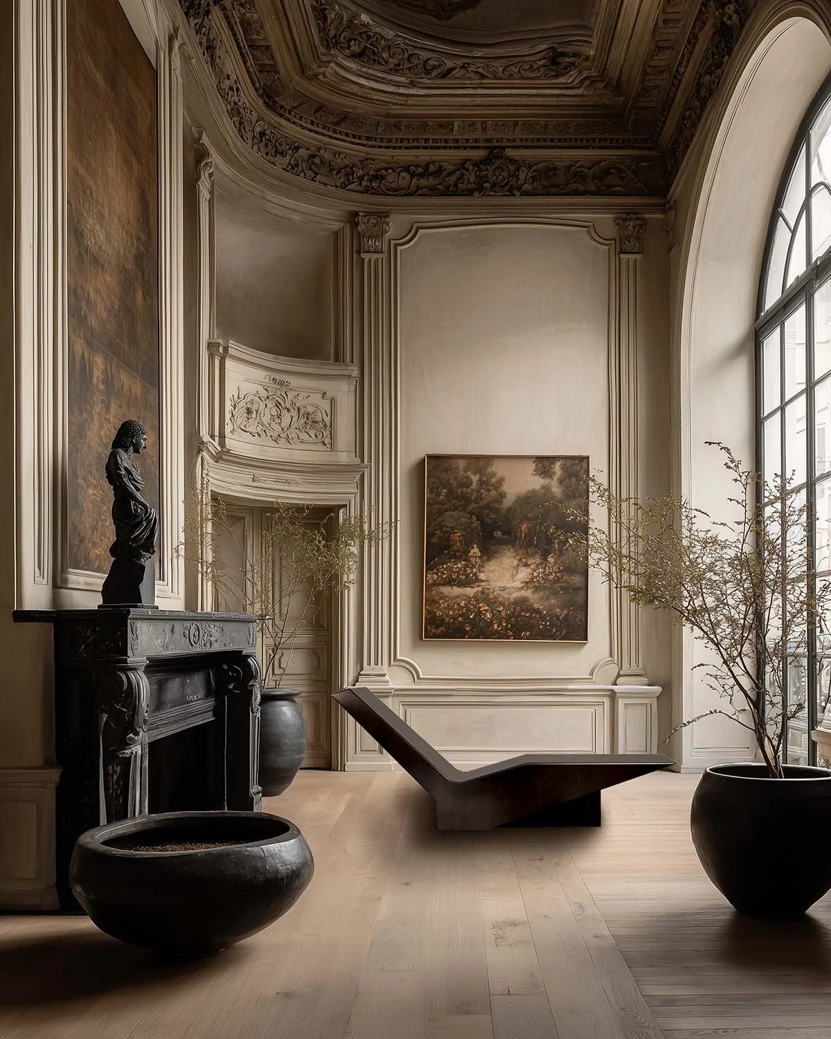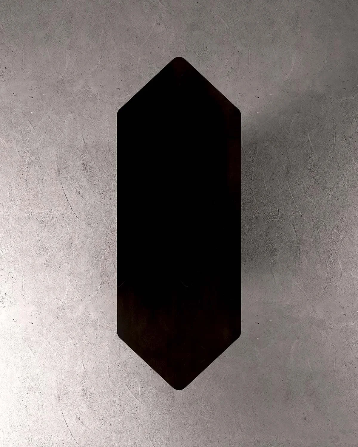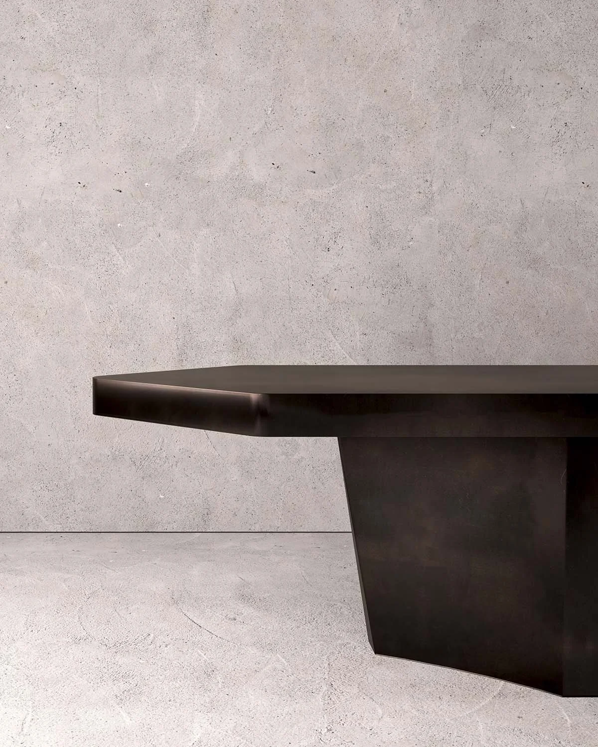 Sculpted with a hexagonal, diamond-ended horizontal plane, the formation asserts its presence with quiet singularity. The pedestal curves inward with subtle concavity, while light diffuses across its blackened bronze surfaces as a push–pull motion becomes visually conscious