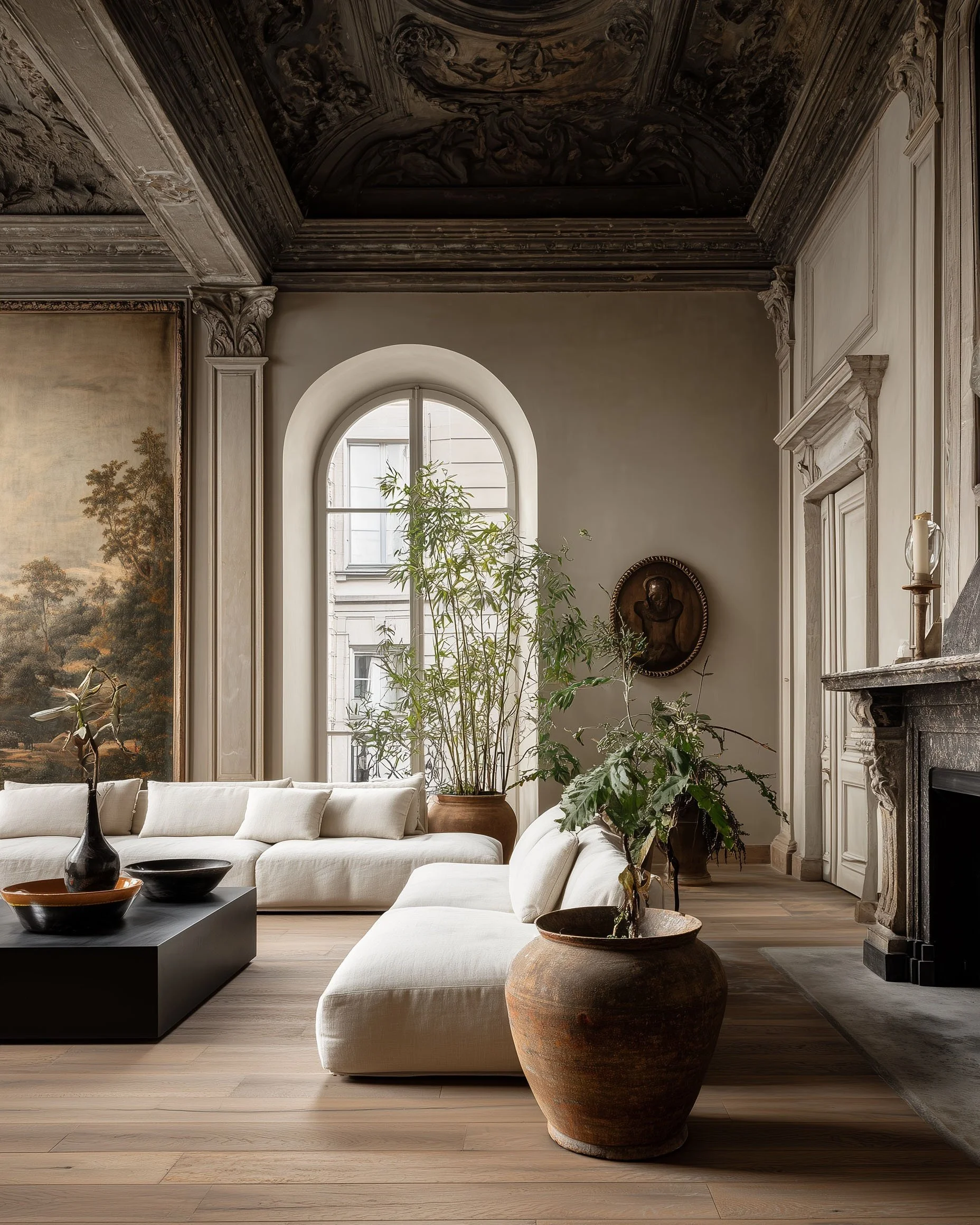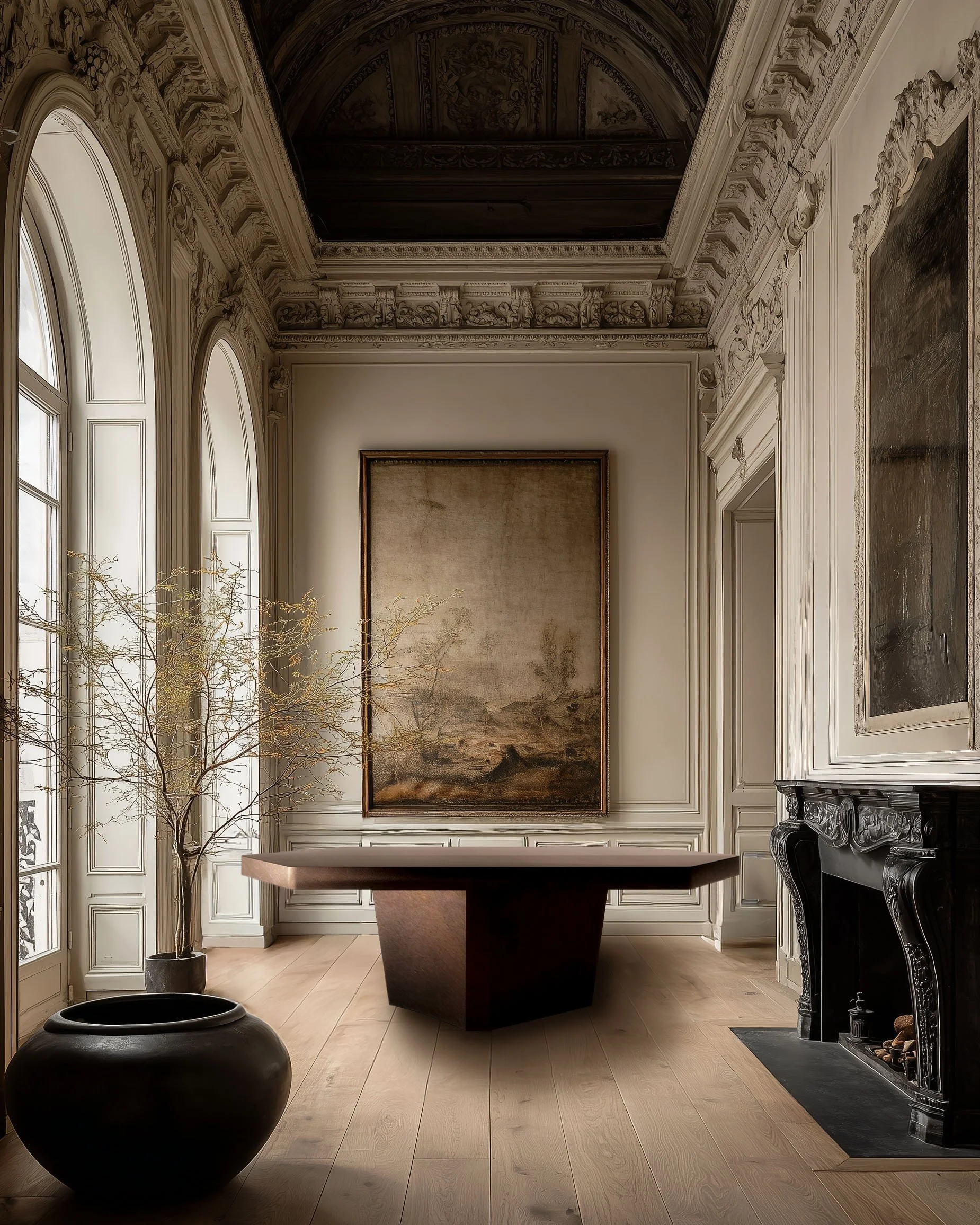 The residence unfolds as a sequence of semi-segregated quarters, with seemingly endless sightlines extending from Parisian window views to carved natural-stone fireplaces. Aged oak wide floorboards run throughout, establishing continuity and grounding the rooms while moderating their scale