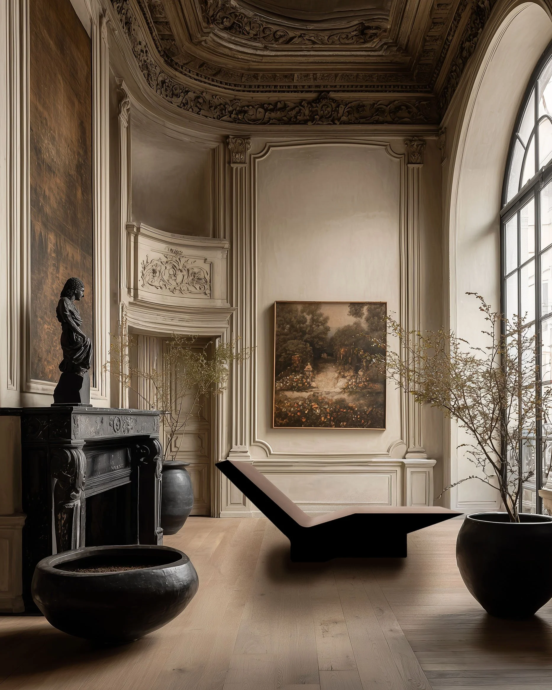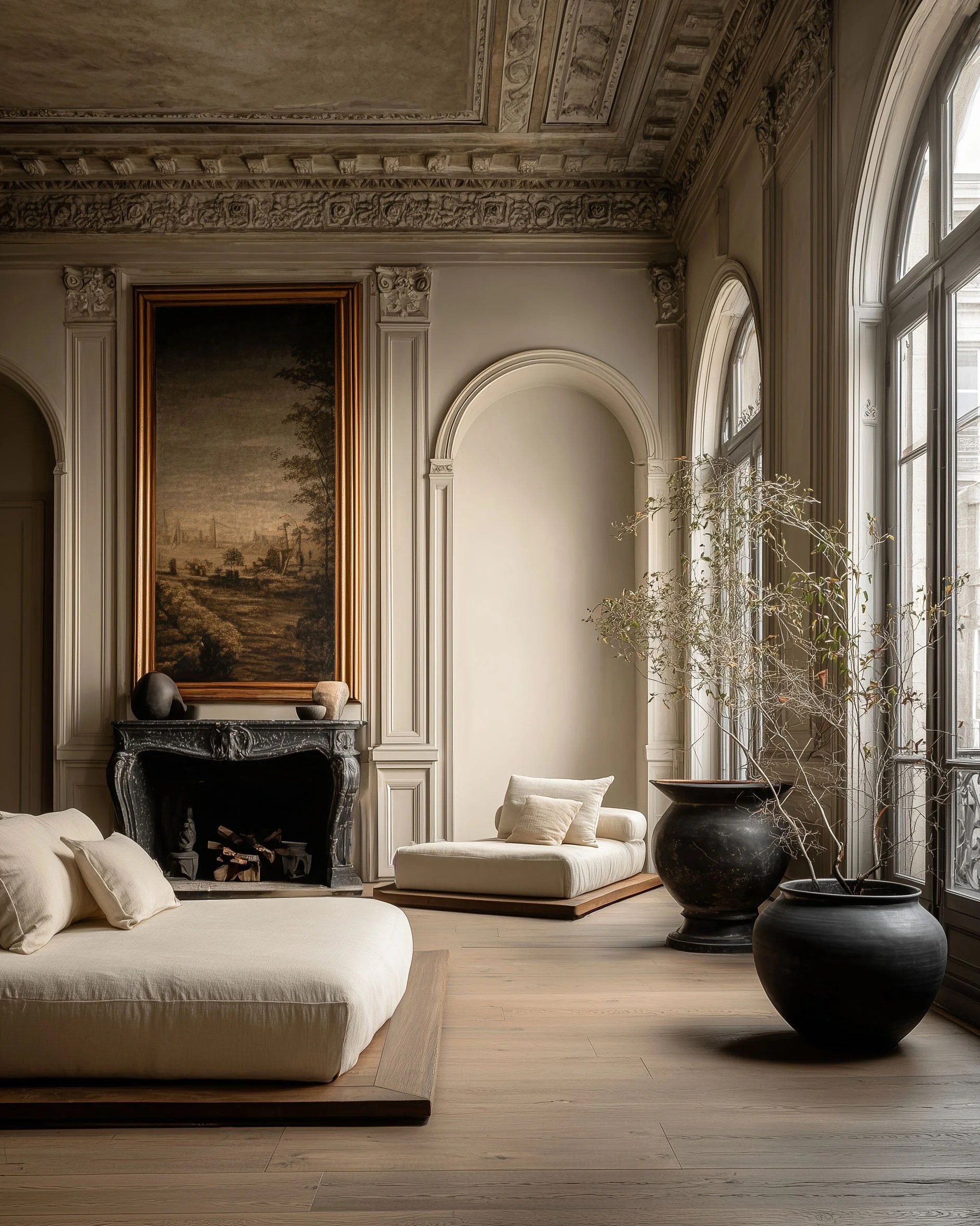 An 18th-century apartment on the Paris Left Bank, Dominique Residence is respectfully restored to its original architectural fabric—ornate plaster ceilings, intricate cornices, arched windows, and deep wall openings